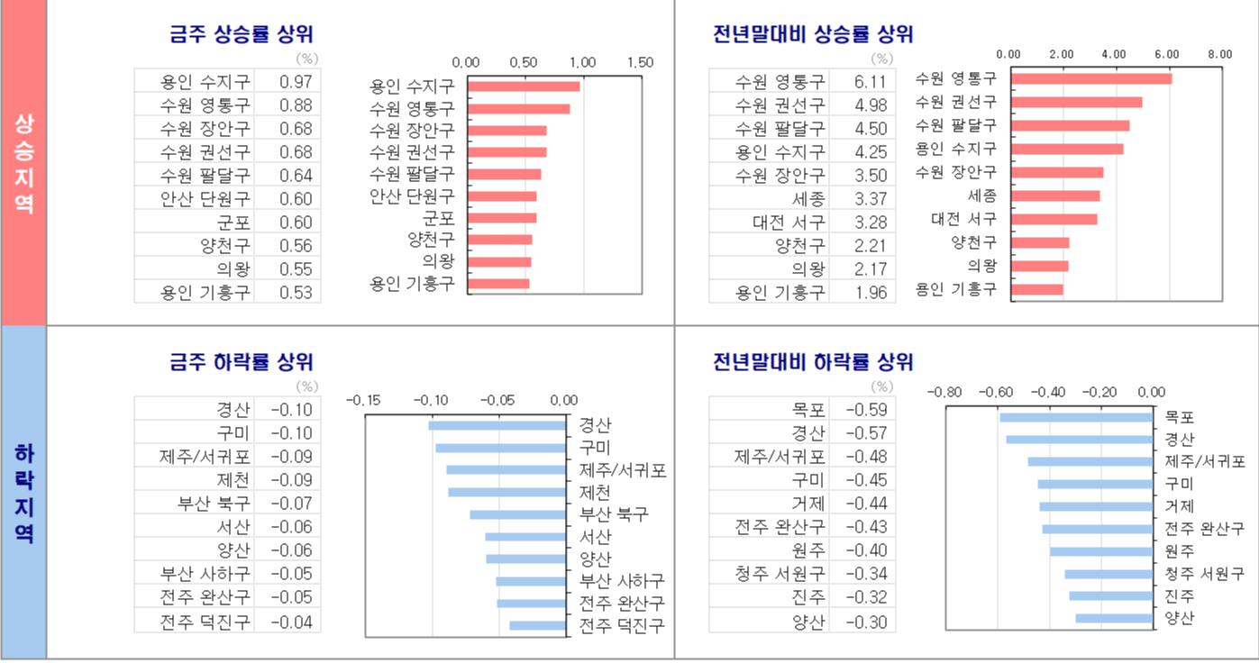 - 경기는 용인 수지구(0.97%)와 수원의 4개 구가 높은 상승을 보이며 전주 대비 0.31% 변동률을 기록했습니다. 주간 상승률이 상대적으로 높은 지역은 용인 수지를 비롯해 수원 영통구(0.88%), 수원 장안구(0.68%), 수원 팔달구(0.64%) 등입니다.