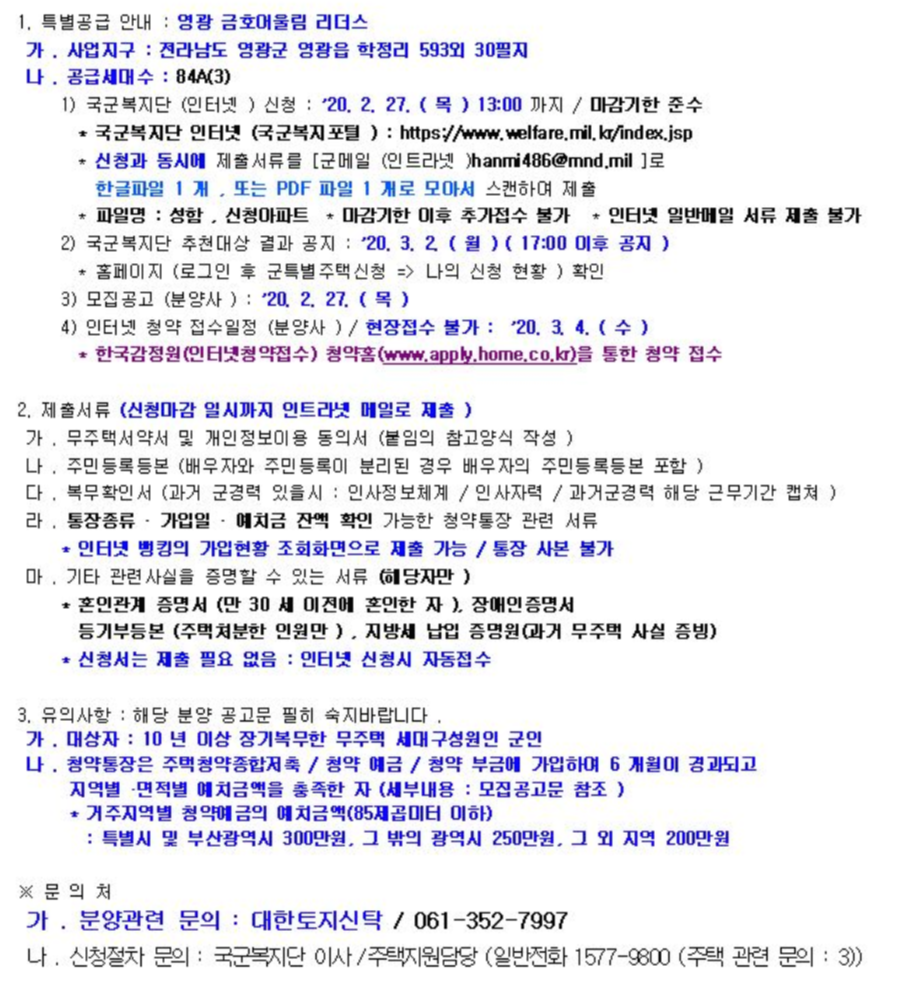 (2) 특별공급요건 : 10년이상 장기복무 무주택 세대구성원 및 군인 / 청약 6개월 경과 / 지역, 면적 예치금충족(전남 영광 200만원)