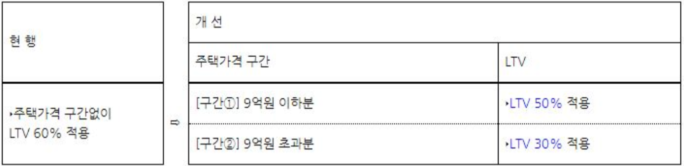 * 9억 원 이하분은 LTV 50% 적용, 9억 원 초과분은 LTV 30% 적용 / 예를 들어 10억 원의 집이라면 (9억 원 * 50% = 4억 5천만 원) + 9억 초과분 (1억 * 30% = 3천만 원)으로 총 4억 8천만 원이 대출이 가능합니다. 종전에 60% 일 경우에 6억과 비교해보면 현금이 1억 2천만 원가량 더 필요합니다.