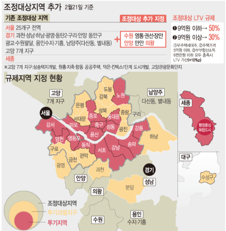 최근에 집값이 급등했던 수원시, 안양시, 의왕시를 2월 21일부로 신규 지정하게 됩니다. 이에 따라 대출규제 및 양도세 중과 전매제한 기간 등 강화된 규제가 적용됩니다.