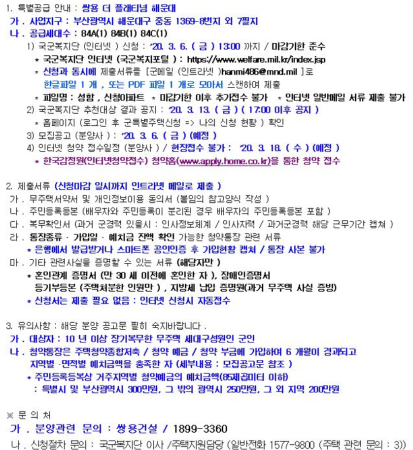 (2) 특별공급요건 : 10년이상 장기복무 무주택 세대구성원 및 군인 / 청약 6개월 경과 / 지역, 면적 예치금충족(부산 300만원)