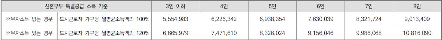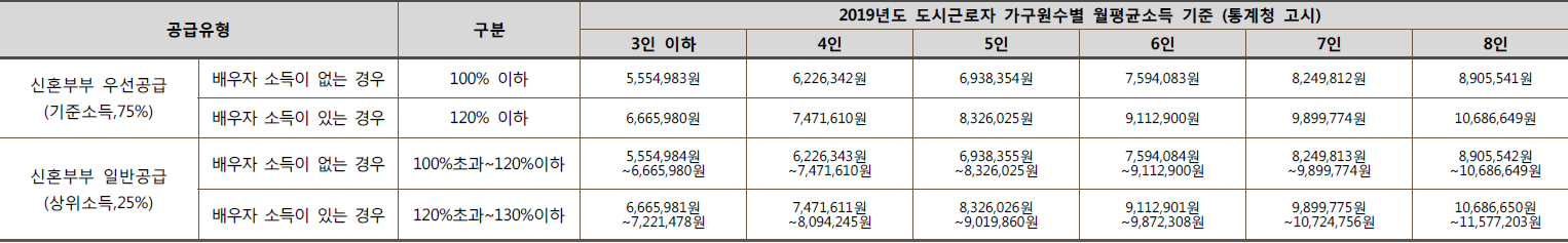 - 입주자모집공고일 현재 도시근로자 가구당 월평균소득액을 충족해야하는데, 무주택 세대 구성원 전원(예비 신혼부부는 입주 시 제출하는 주민등록표 등본에 등재되는 ‘혼인으로 구성될 세대’를 말함)의 소득을 합산하여 산정합니다.