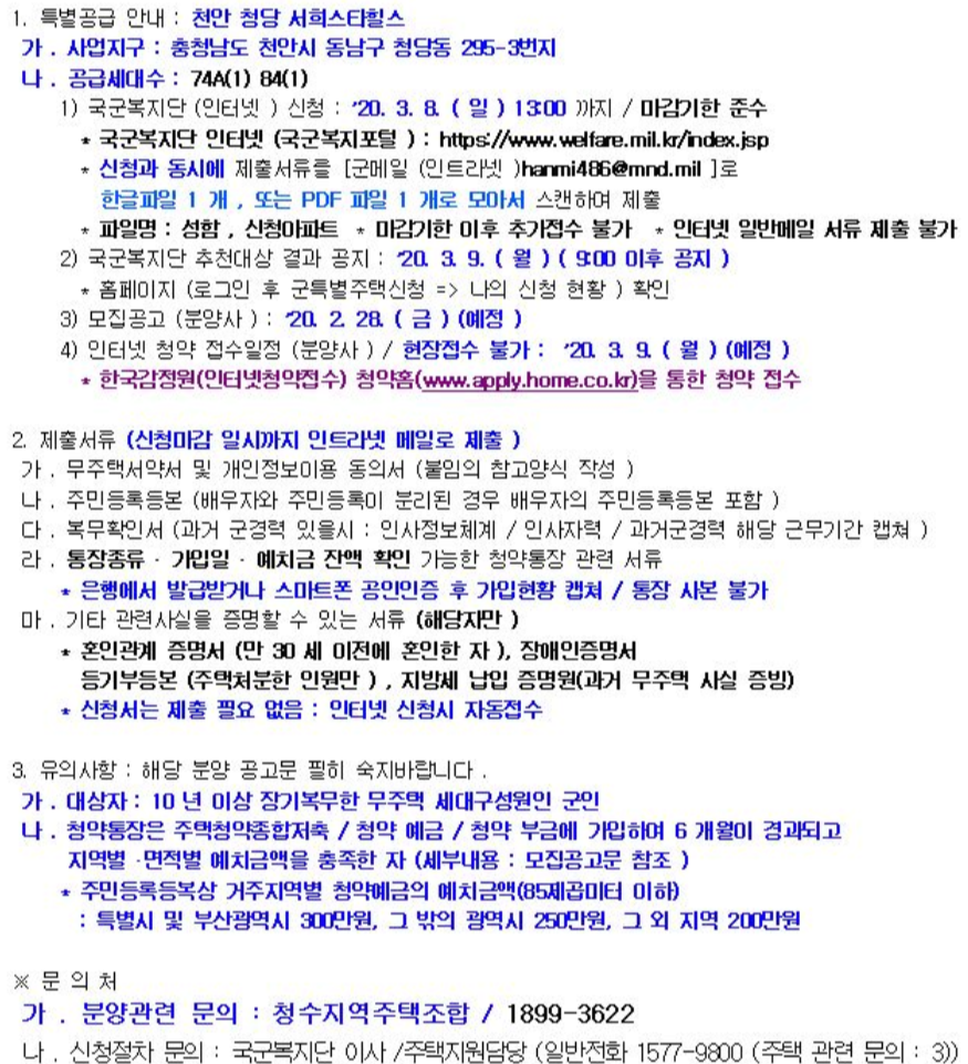 (2) 특별공급 요건 : 10년 이상 장기복무 무주택 세대 구성원 및 군인 / 청약 6개월 경과 / 지역, 면적 예치금 충족(충남 200만 원)