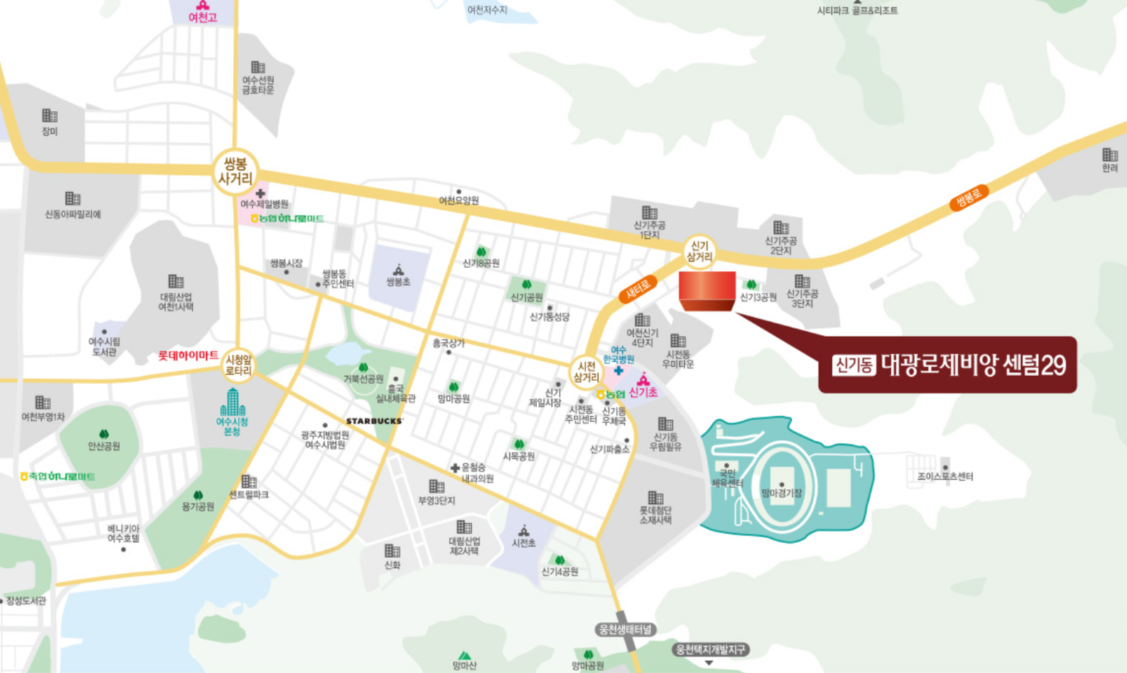 (1) 입지 : 여수는 웅천지구가 대장인데요, 그보다는 북쪽에 위치해있습니다. 순천, 광양과 생활권을 함께하는 도시입니다.