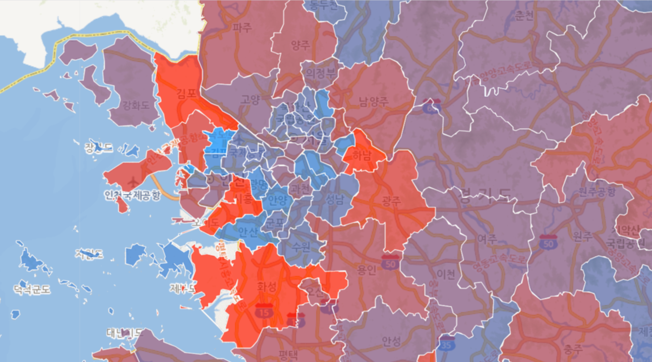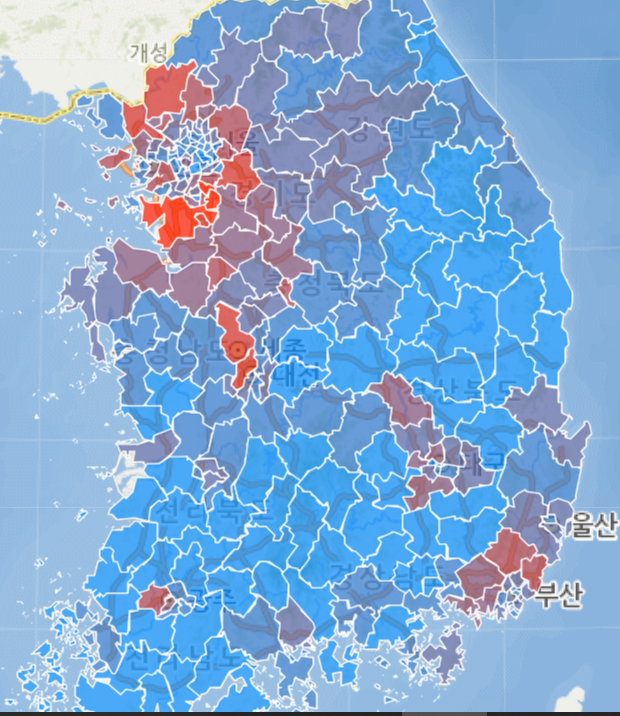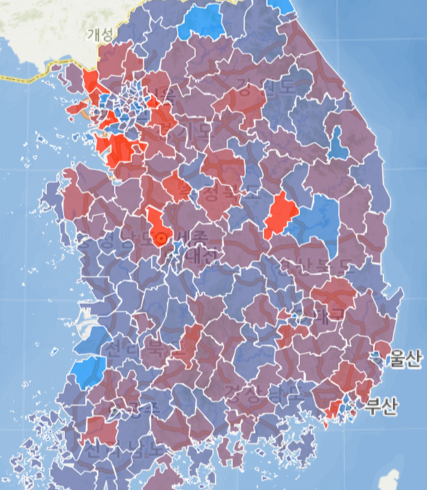 ※ 범례 : 파란색이 진할수록 1인가구 증가율이 낮고, 붉은색이 진할수록 1인가구 증가율이 높습니다.
