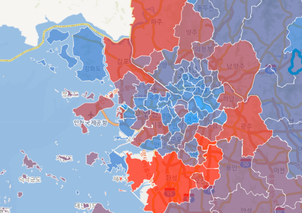 ※ 범례 : 붉은색이 진할수록 인구밀도가 높은지역입니다.