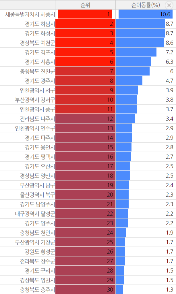 순이동이 높은 상위 30개의 시군구 입니다. 세종시의 순유입이 많고, 수도권에서는 하남, 김포, 시흥, 광주, 등 이동률이 높습니다. 특히, 저는 세종시와 하남시에 순이동률에 주목하고 있습니다. 수요가 증가하는 지역 중 주변에 일자리가 많은 곳들은 입지가치가 좋아진다고 볼 수 있습니다.