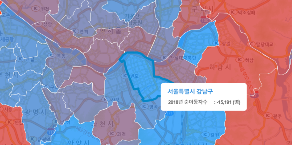 ※ 범례 : 파란색이 진할수록 인구의 순유출이 강하고, 붉은색이 진할수록 순유입이 많습니다.