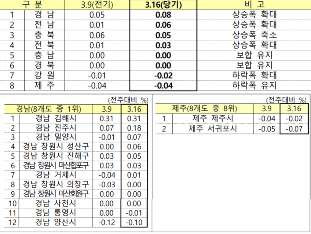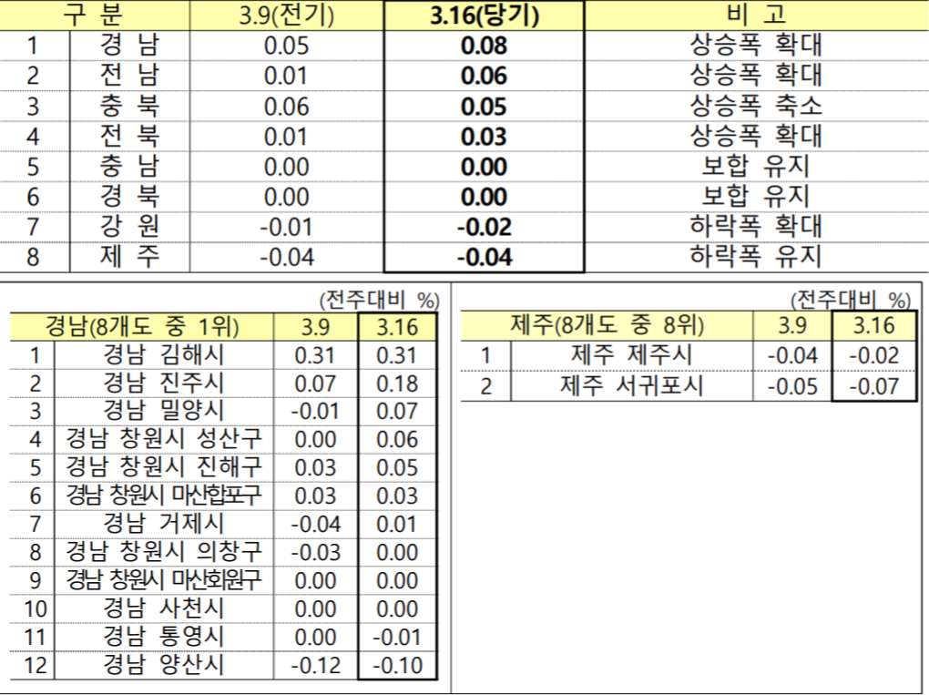 울산(0.09%)은 울주군(0.15%) 및 남구(0.12%), 북구(0.09%) 등 전 지역에서 상승하였습니다.
