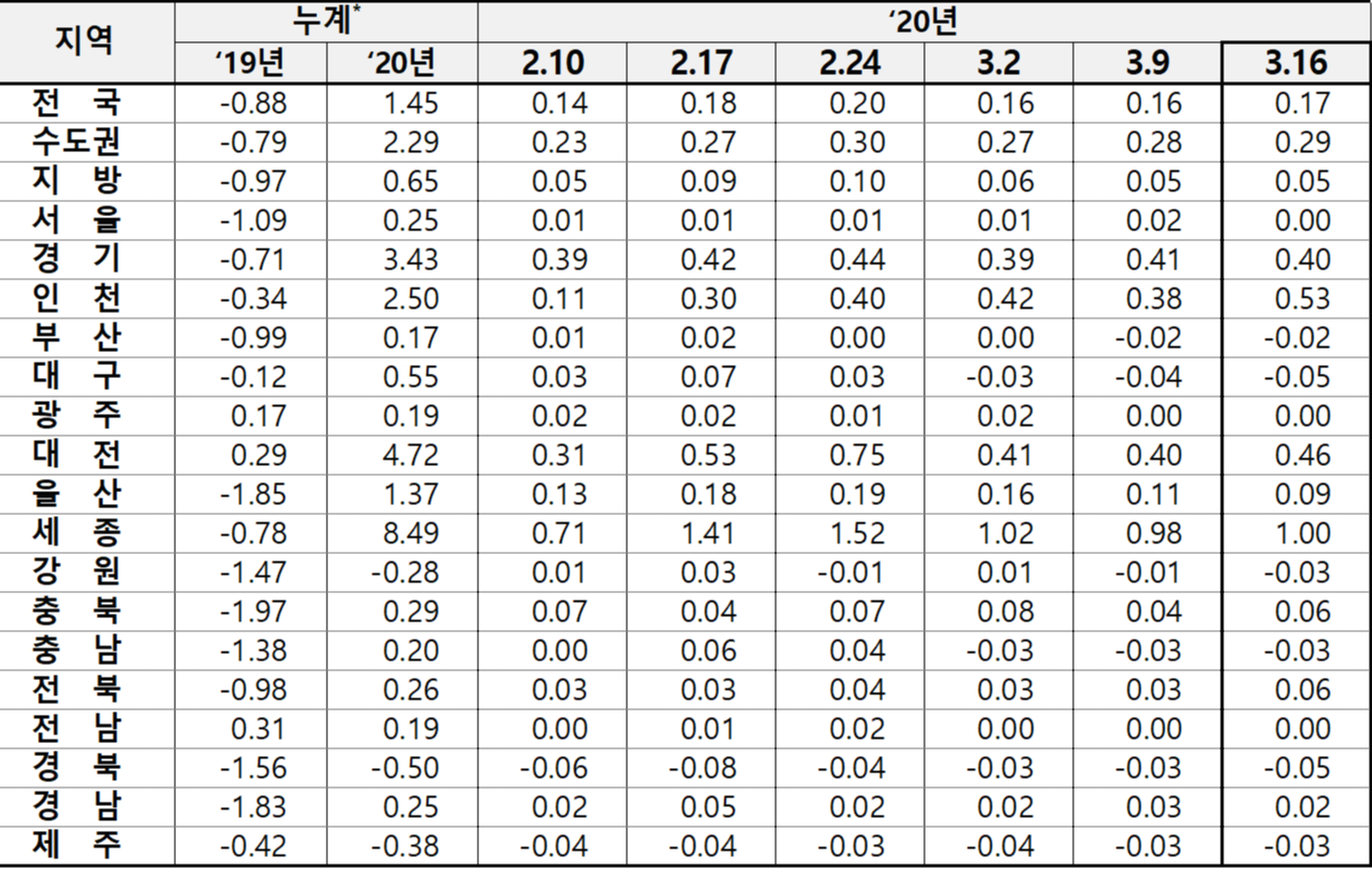 - 서울(0.02%->0.00%)은 코로나 19 사태와 경기침체 우려, 대출규제 강화 등으로 불확실성이 확산되는 가운데 강남권 재건축과 고가 단지 위주로 매수세 감소하고 매물 가격이 가격하락 하는 등 하락폭이 확대되며 37주 만에 보합으로 전환했습니다.