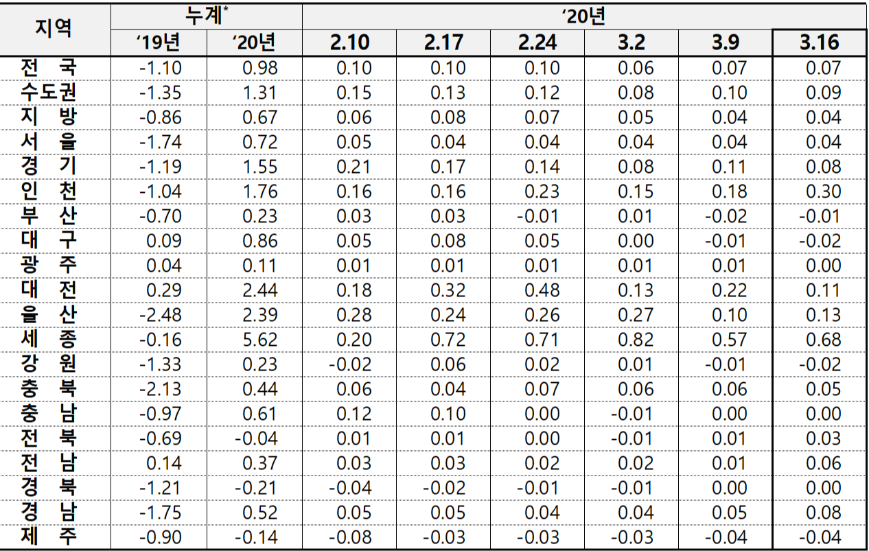 | 2020년 3월 23일 기준 주간아파트가격동향(한국감정원) (2) | 2020.03.29 |