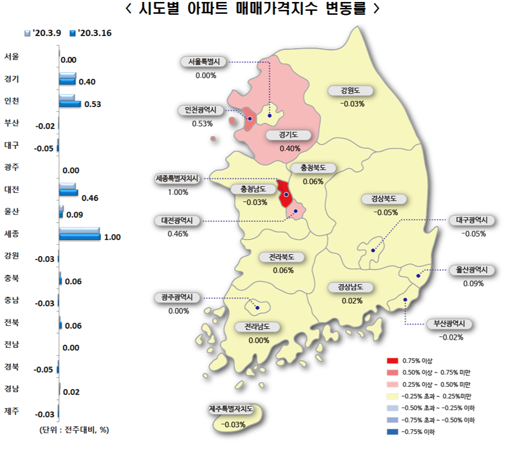 - 세종(0.98%%->1.00%)은 상승폭이 확대되었습니다. 인구유입 및 입주물량 감소 등으로 상승이 지속되는 가운데 정부청사 인근 및 상대적으로 저평가된 단지 수요 및 대전 출퇴근 수요로 상승세가 지속되었습니다.