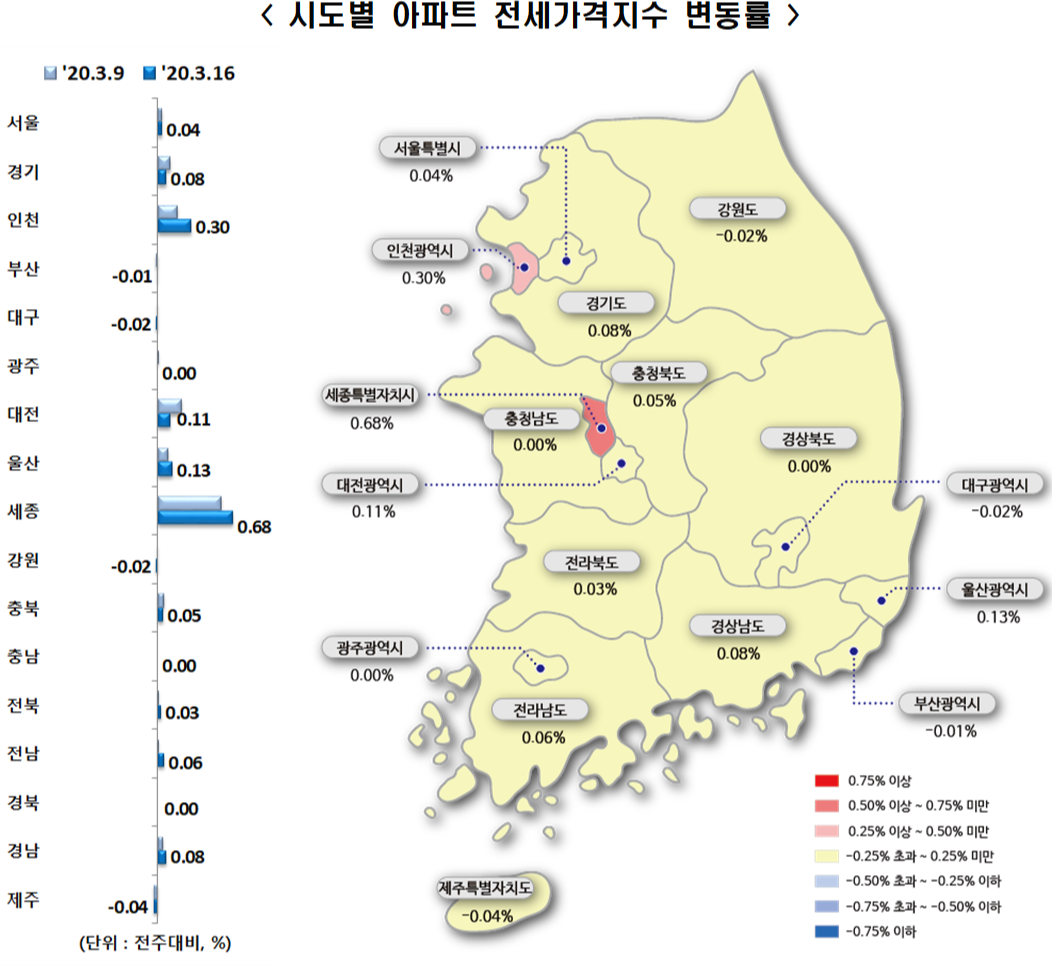 - 서울(0.04%->0.04%)은 코로나19여파 등으로 대다수 지역에서 안정세를 이어가나, 봄 이사철 도래, 정비사업 이주수요, 매매 시장 위축 영향 등으로 학군이 우수한 지역과 역세권 인기 대단지, 상대적으로 가격대가 낮은 단지 위주로 지난주 상승폭을 유지하였습니다.
