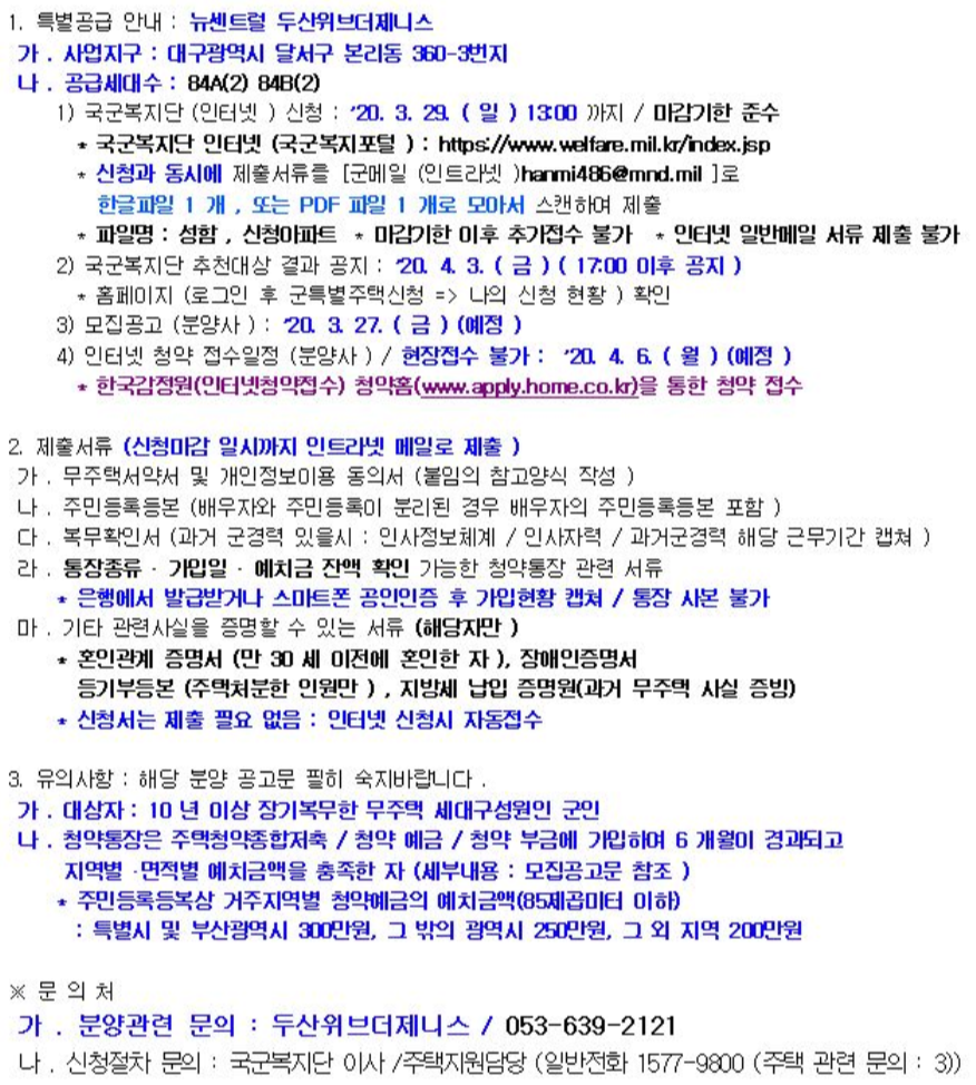 (2) 특별공급요건 : 10년이상 장기복무 무주택 세대구성원 및 군인 / 청약 6개월 경과 / 지역, 면적 예치금충족(대구 250만원)