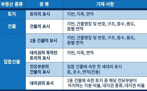 - 표제부는 부동산의 소재지(지번 및 지목 등)를 나타내고 있습니다. 부동산의 종류에 따라 아래 그림과 같은 항목으로 구성됩니다.