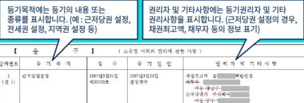 - 을구는 소유권 이외의 권리관계를 나타내고 있는데, 담보대출을 통한 근저당권의 채권최고액 설정, 전세권, 지역권 등이 대표적입니다.