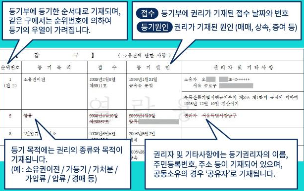 - 갑구는 소유권 및 소유권과 관련된 권리관계를 나타내는데 소유권과 이전 등이 대표적입니다. 경매를 공부하시다 보면 관련된 부분이 갑구인데요, 가등기, 가압류나 압류, 경매개시 등을 알 수 있습니다. 특히, 부동산 계약 시에는 매도인 또는 임대인의 이름이 등기부상 소유자의 이름과 정보가 동일한지 꼼꼼히 확인해야 합니다.
