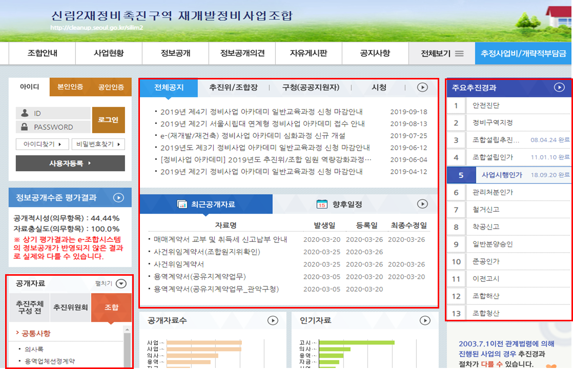 홈페이지 중앙에는 조합과 구청 및 시청의 공지사항과 최근 공개자료와 향후 일정을 살펴볼 수 있는데요, 정비사업의 투명성을 제고하기 위한 홈페이지로 조합이 무엇을 하는지 알 수 있는 홈페이지입니다.