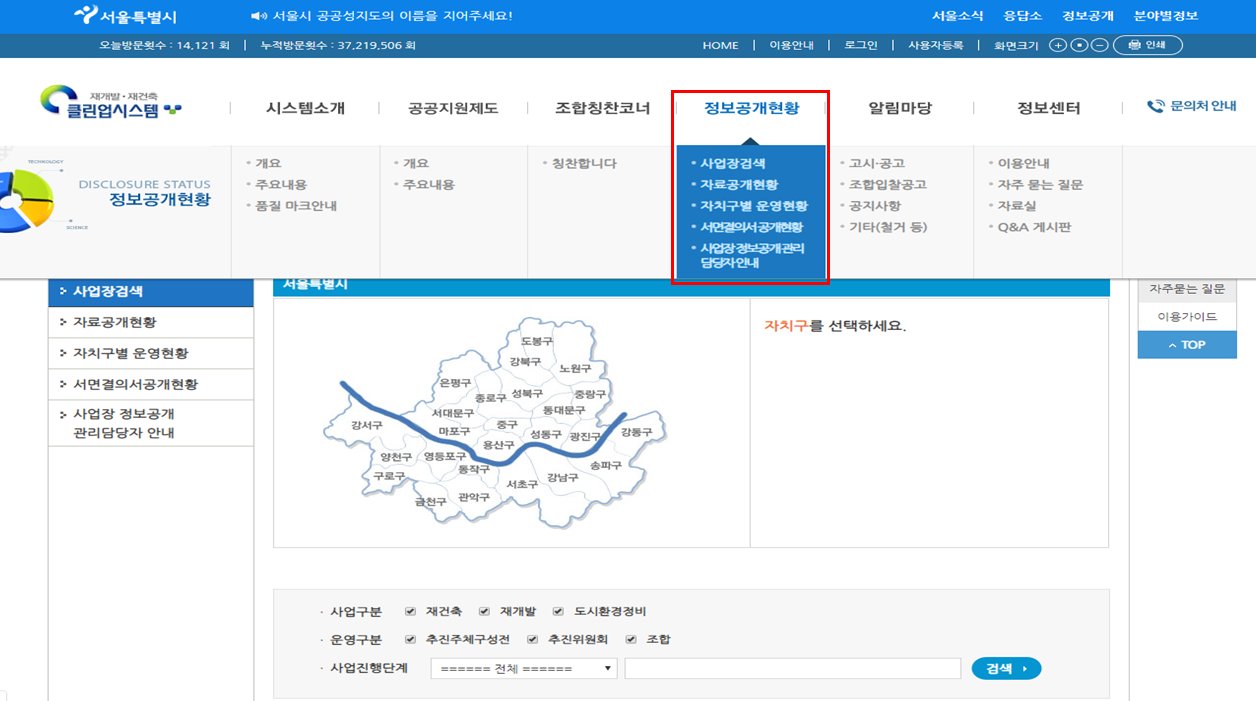 먼저 클린업시스템 홈페이지(링크)에 접속합니다. 이후에 정보공개 현황을 클릭하면 사업장 검색, 자료 공개현황, 자치구별 운영현황 등이 나오는데요, 아래의 지도에 서울시 자치구별로 클릭할 수 있습니다.