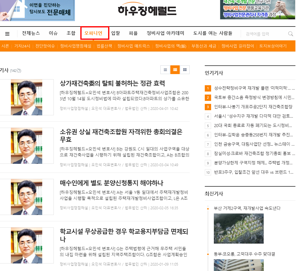 마지막으로 오피니언 탭을 클릭하시면 정비사업과 관련된 법률이나 해설, 지식 등이 다양하게 수록되어 있습니다. 평소에 질문사항이나 의문사항은 오피니언탭을 통해 검색하시면 어느정도 해소가 될 수있습니다.
