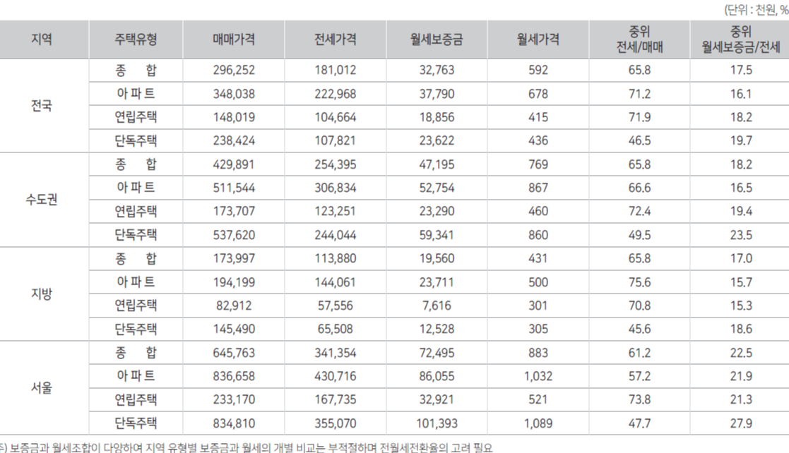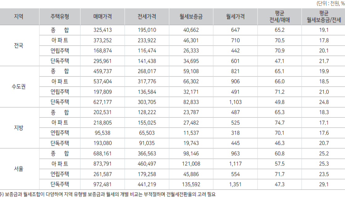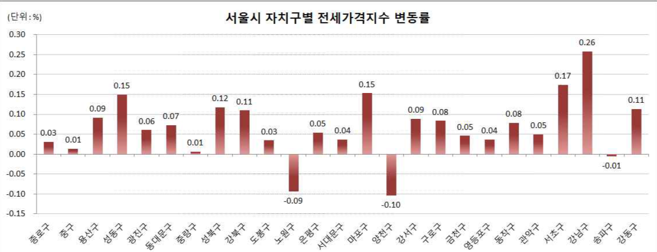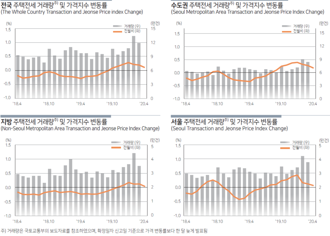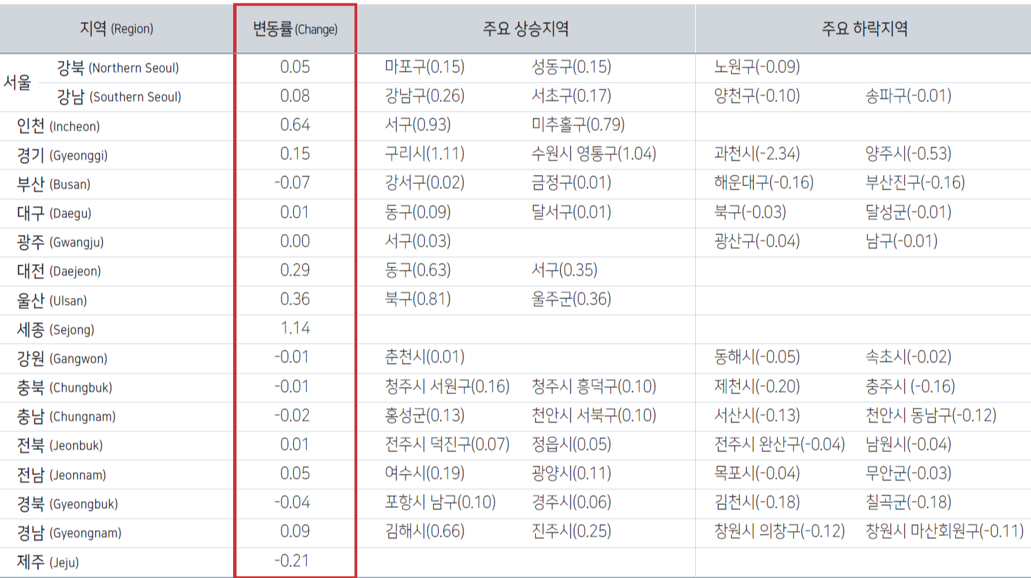 - 지방에서는 세종(1.14%)이 교통 및 편의시설 접근 양호한 지역위 주로, 울산(0.36%)은 전세물량 부족 및 근로자 유입에 따른 수요 증가 영향으로 상승했으나, 제주(-0.21%), 부산(-0.07%), 경북(-0.04%)은 코로나 19 확산, 부동산 경기 침체, 매수심리 및 거래 위축 등으로 하락했습니다.