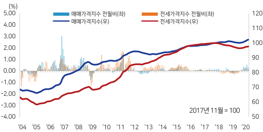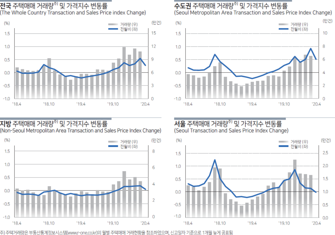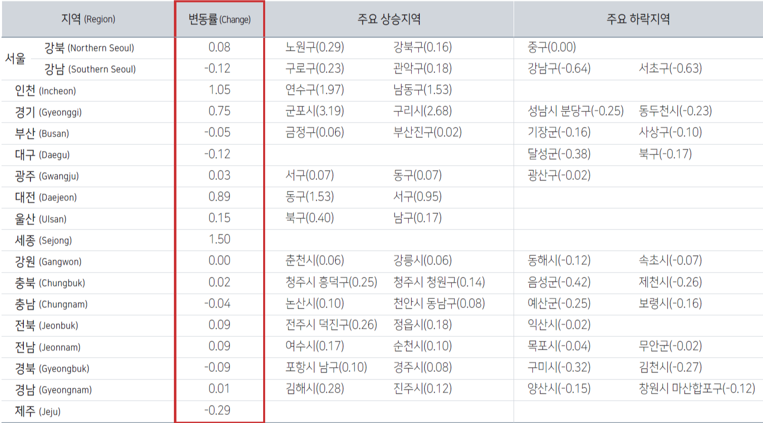 - 지방의 경우 대전(0.89%)은 혁신도시 및 역세권 개발 기대감과 정비사업 진척 등으로, 전북(0.09%), 전남(0.09%) 등은 정주여건 양호한 지역 및 신축 아파트 수요로 상승했으나, 대구(-0.12%)는 코로나 19 확산 여파 등으로 매수심리 위축되며, 제주(-0.29%), 경북(-0.09%) 등은 지역경기 부진 및 입주물량 누적 등으로 하락했습니다.