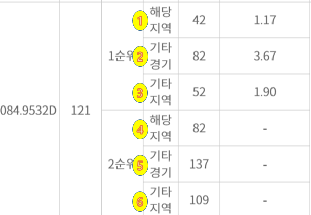① 총 121세대 중 해당지역에 30%인 36세대가 할당되었네요, 1순위 해당지역 42명이 접수하여 낙첨한 6명이 기타경기로 포함되어 다시 경쟁하게됩니다.