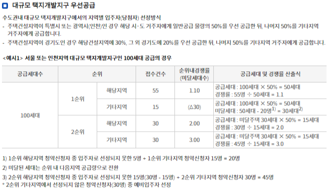 예를 들면, 서울(또는 인천)에서 공급하는 주택이라면 서울(또는 인천) 거주자에게 50%를 공급하고, 그외 수도권(경기,서울 또는 인천)거주자에게 50%를 공급하는 것입니다. 100세대를 공급한다면 각각 50%인 50명씩 공급하게 됩니다.