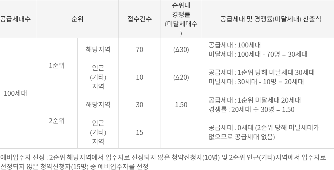* 미달세대(33세대) - 22세대(기타지역지원자) = 11세대(미달세대)로 2순위 해당지역에게 기회부여