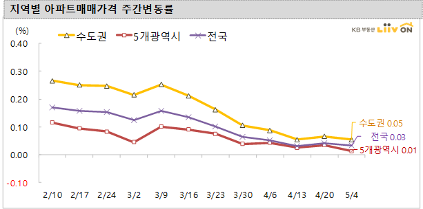 5월 4일 기준 주택시장 동향 자료에 따르면 서울은 대부분 지역이 보합을 보이고 강남 3구가 6주 연속 하락하는 모습을 보였습니다.