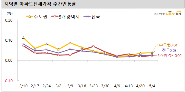 전국 아파트 전세 가격은 전주 대비 0.03%의 미미한 상승을 기록했습니다. 수도권(0.04%)과 5개 광역시(0.02%)는 전주대비 미미하게 상승했고, 기타 지방(0.00%)은 보합을 기록했습니다