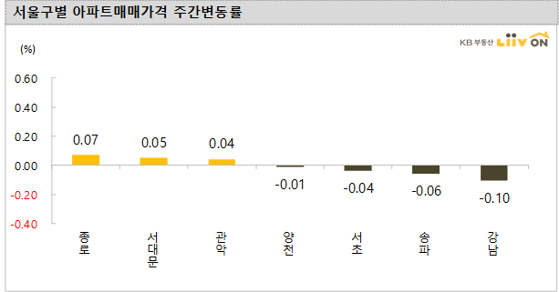 - 서울 아파트 매매 가격은 다수의 지역이 보합을 보이면서 서울 전체적으로도 보합을 기록했습니다. 강남구(-0.10%), 송파구(-0.06%), 서초구(-0.04%) 를 비롯해 양천구(-0.01%)가 하락했습니다.