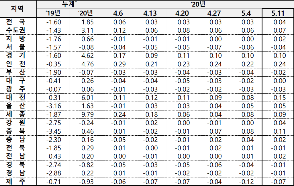 안녕하세요? 부자아빠의 부동산연구소입니다. 오늘은 한국감정원에서 발표한 5월 11일 기준 주간 아파트 가격동향을 살펴보겠습니다. 0220 부동산 대책, 코로나 19의 영향의 반영된 모습입니다. 매번 말씀드리지만 후행지표로 투자 전에는 별도의 지역별, 단지별 임장을 필히 하시기 바랍니다~