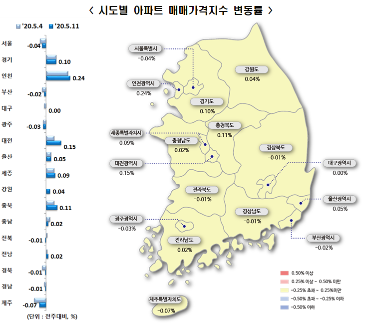 - 세종(0.14%->0.03%)은 상승폭이 축소되었습니다. 행복도시 내 입지여건 양호한 도담 및 새롬동 위주로 상승했으나 생활 속 거리두기 등으로 관망세를 보이며 전체적인 상승폭은 축소되었습니다.