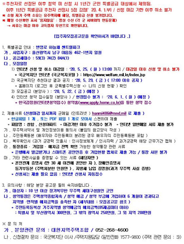 (2) 특별공급요건 : 10년이상 장기복무 무주택 세대구성원 및 군인 / 청약 6개월 경과 / 지역, 면적 예치금충족(울산 250만원)