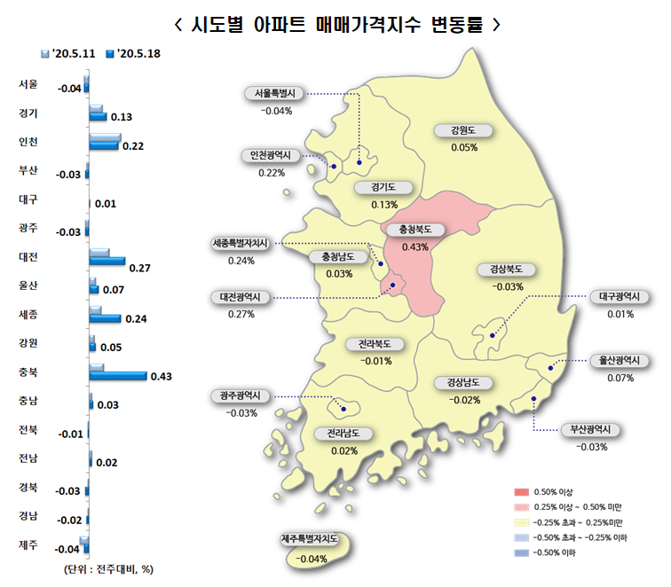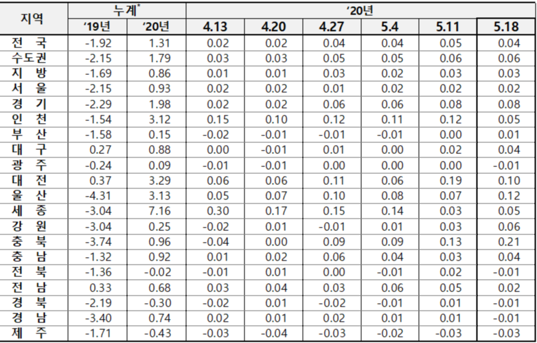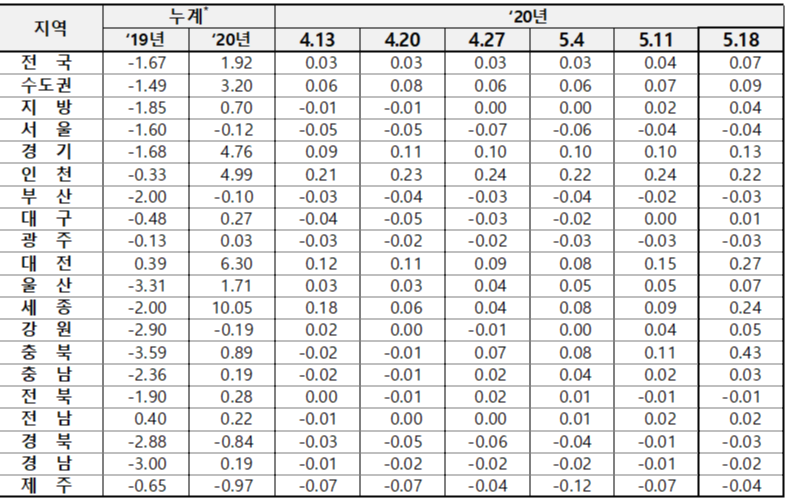 안녕하세요? 부자아빠의 부동산연구소입니다. 오늘은 한국감정원에서 발표한 5월 18일 기준 주간 아파트 가격동향을 살펴보겠습니다. 0220 부동산 대책, 코로나 19의 영향의 반영된 모습입니다. 매번 말씀드리지만 후행지표로 투자 전에는 별도의 지역별, 단지별 임장을 필히 하시기 바랍니다. 부동산 동향을 필사함으로써 인사이트를 키우는데 목적을 두고 있습니다.