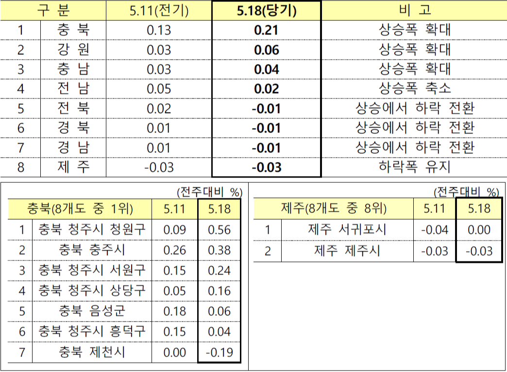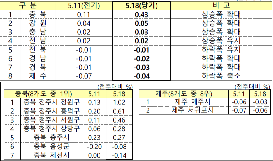 - 그 외 8개도(0.01%->0.04%)는 소폭 상승했습니다. 특히, 청주(0.60%)는 방사광 가속기 부지선정(5.8) 호재 등으로 가격 상승 기대감 있는 가운데, 청원(1.02%)은 오창읍과 주중동 위주로, 흥덕(0.61%)은 가경동 위주로 상승폭이 확대되었습니다.