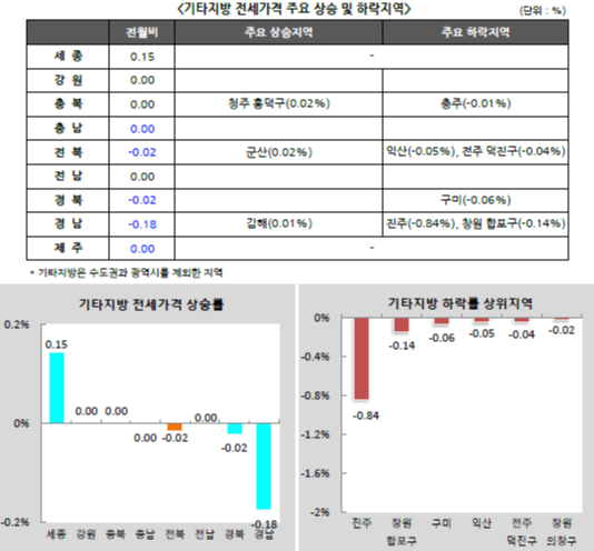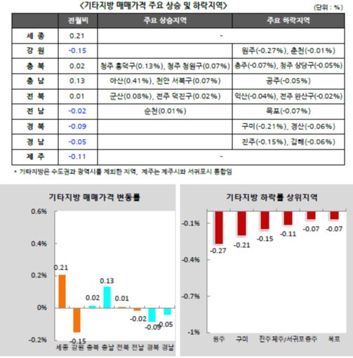 광역시 이외의 시도에서는 강원(-0.15%), 경북(-0.09%), 경남(-0.05%), 전남(-0.02%)은 하락했으며 세종(0.21%), 충남(0.13%), 충북(0.02%), 전북(0.01%)은 전월 대비 상승입니다.