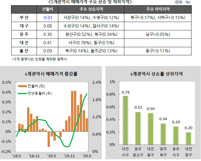 인천을 제외한 지방 5개 광역시는 대전(0.41%)이 조금 높게 상승하였고, 광주(0.30%), 울산(0.09%), 대구(0.08%)는 전월 대비 상승했고, 부산(-0.01%)은 하락했습니다.
