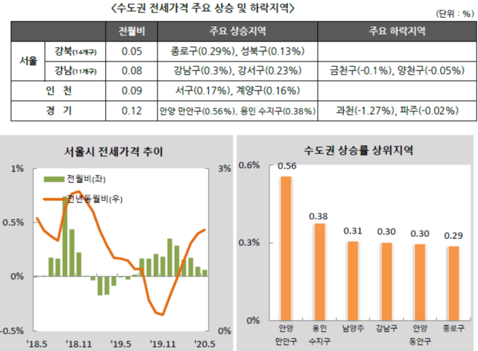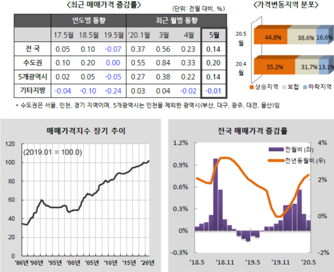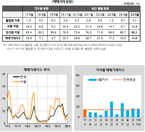 2020년 5월 매매가격은 전월대비 0.14% 상승을 기록했습니다. 3월부터 3개월 연속 마이너스를 기록했지만 하락폭이 줄어들었고, 서울의 매매가격 전망지수는 하락 전망이 깊어지지 않고 살짝 반등하면서 부정적인 시장분위기로 넘어가지 않고 있다.