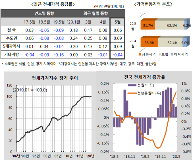 서울(0.06%)은 전월 대비 소폭 상승했고, 수도권(0.09%)도 전월 대비 소폭 상승하는데 그쳤다. 5개 광역시(0.09%)는 상승, 기타 지방(-0.04%)은 하락했습니다.
