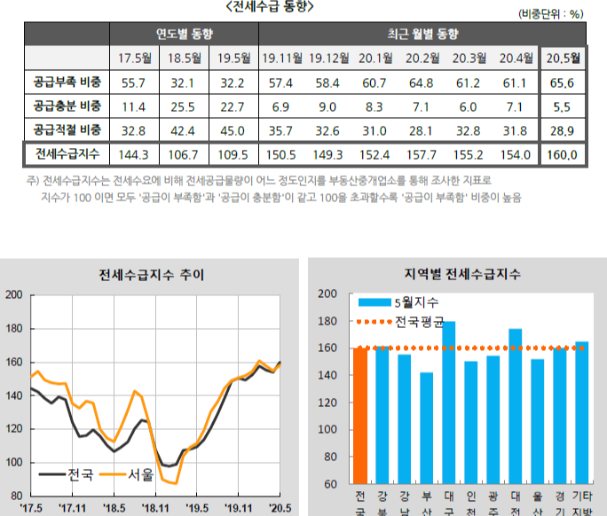 일선 중개업소에서 체감하는 전세공급 물량 부족 정도를 나타내는 전국의 전세수급지수는 160을 기록 지난달(154)대비 상승하였습니다. 기존 전세 물량은 소진되고 더 이상의 전세공급이 원활하지 않으면서 전세수요에 미치지 못하는 모습을 보여줬습니다.