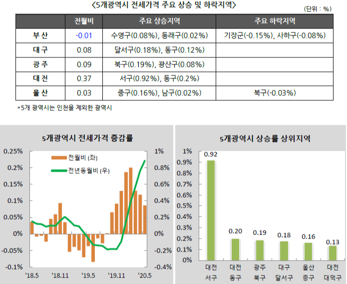5개 광역시에서는 대전(0.37%), 광주(0.09%), 대구(0.08%), 울산(0.03%)은 상승했고, 부산(-0.01%)은 하락했습니다.