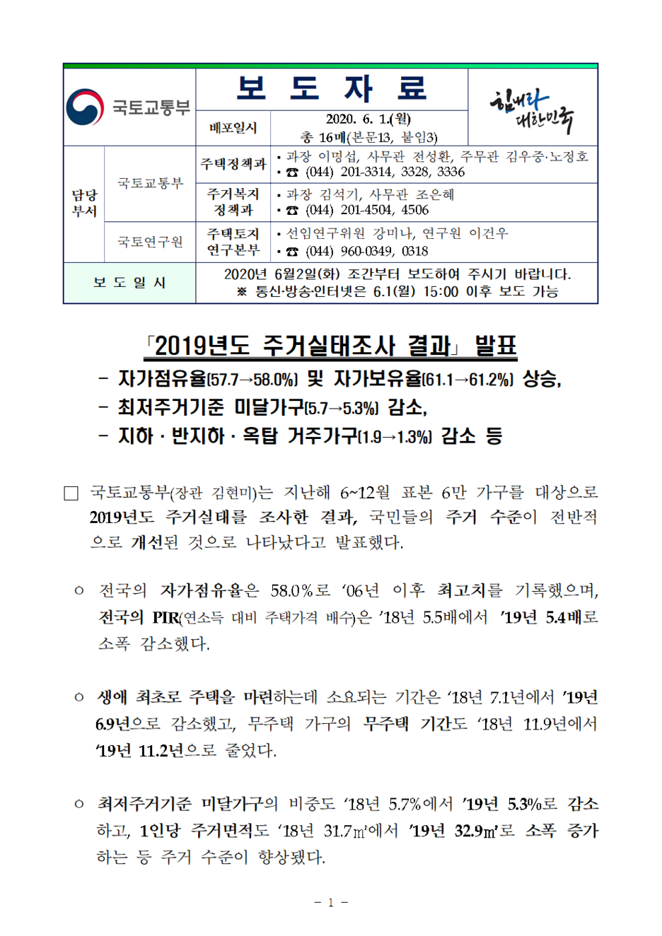 주거실태조사는 국토교통부에서 2019년도 6월에서 12월의 표본 6만 가구를 대상으로 조사하여 국민들의 주거수준을 확인하는데 있습니다.