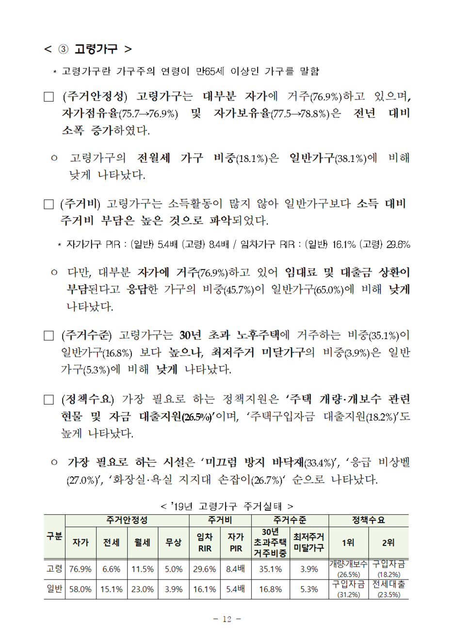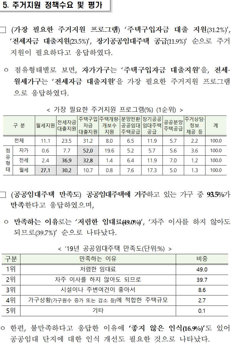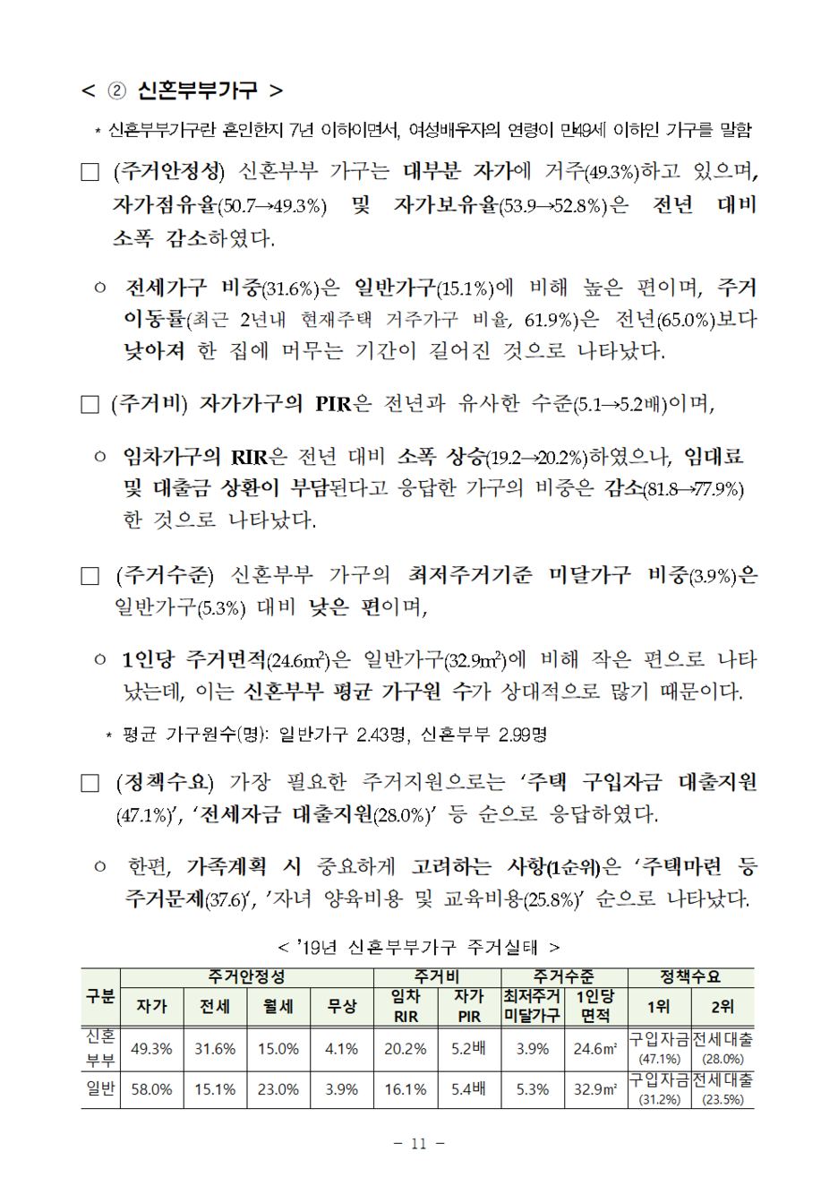 이외에도 현재의 주거지원 정책수요 및 평가와 특성가구(청년,신혼부부,고령가구)별 주거실태내용을 포함하고 있습니다.