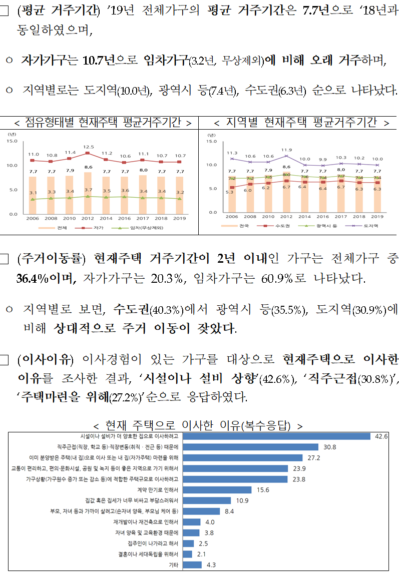 일반 가구는 평균적으로 7.7년을 거주하며 자가가구의 경우는 10.7년 임차가구의 경우 3.2년을 거주하며 이사를 하고 있습니다.