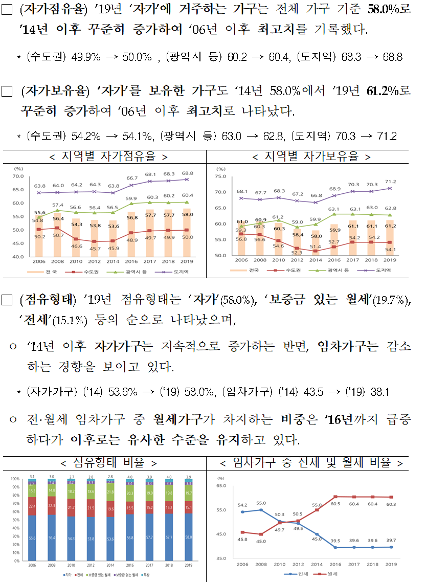 자가 점유율은 2014년 이후 꾸준히 증가하여 '06년 이후 최고치인 58%를 기록하고 있는데요, 수도권은 약 50%의 자가점유율을 보여주고 있고, 광역시는 60.4%, 그외 도지역은 68.8% 나타내고 있습니다.
