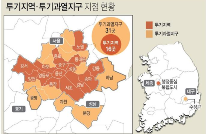 두 번째로 투기과열지구는 서울 전역과 하남, 광명, 과천, 성남 분당구, 세종특별시 그리고 대구 수성구가 포함됩니다.