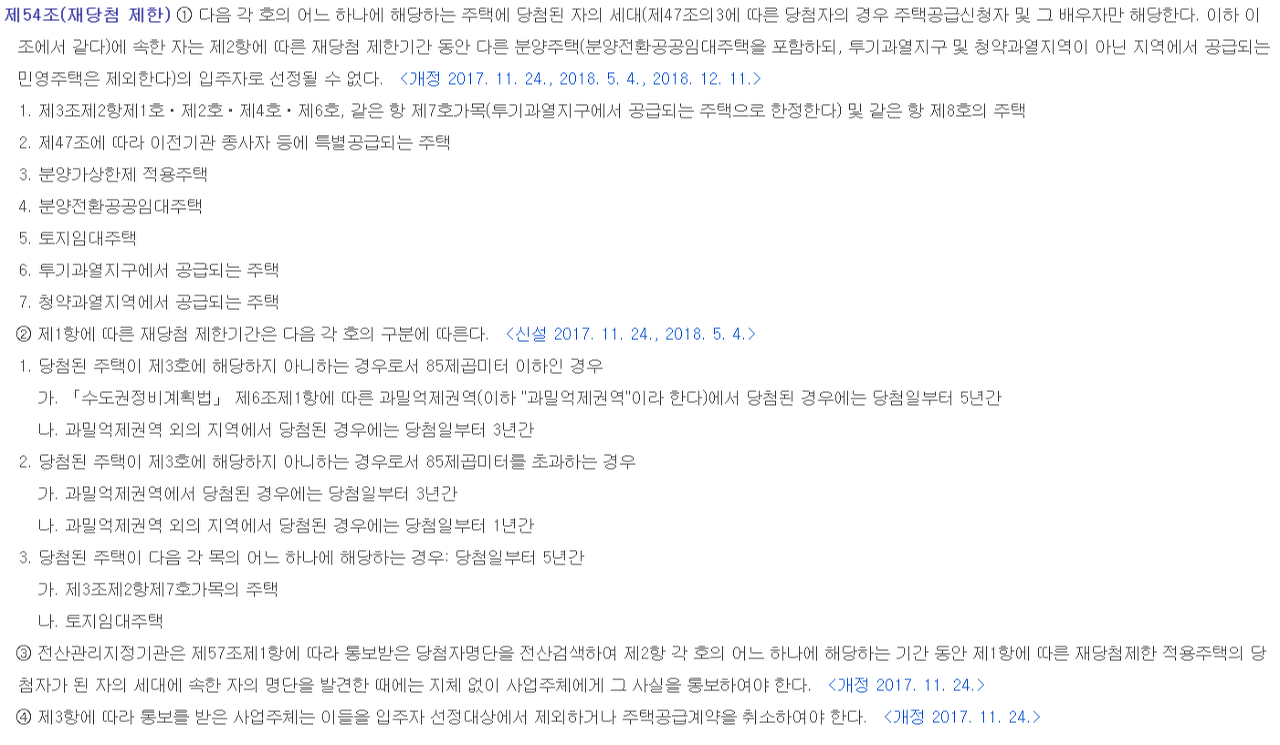 * 청약 재당첨 제한에 관한 내용은 주택공급에 관한 규칙 제54조에서 알 수 있습니다. 아래는 원문입니다.