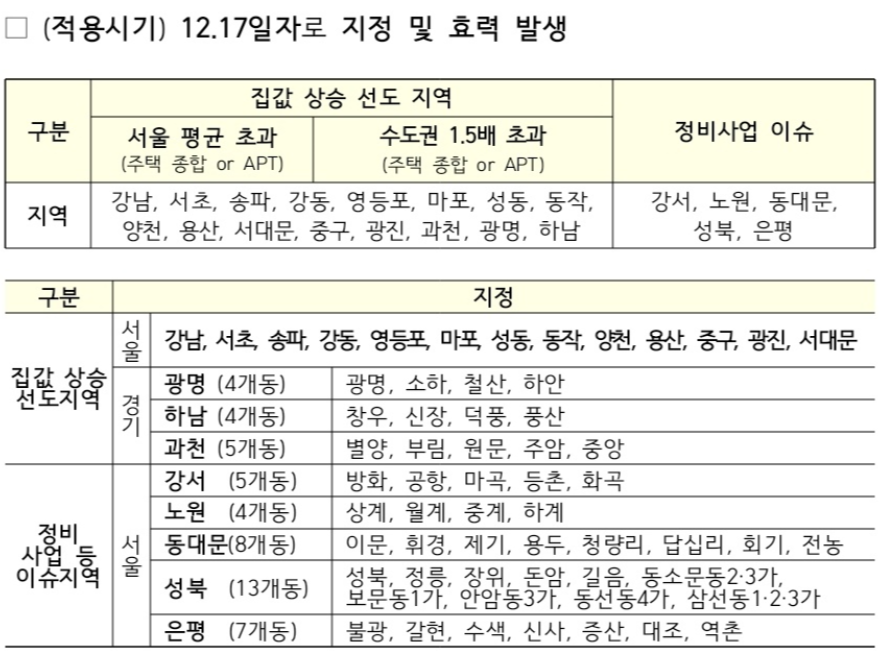 위의 원문은 다소 이해가 안되니 작년에 발표한 1216 부동산 대책에 표를 보시면 이해가 조금 이해가 수월할 것입니다.